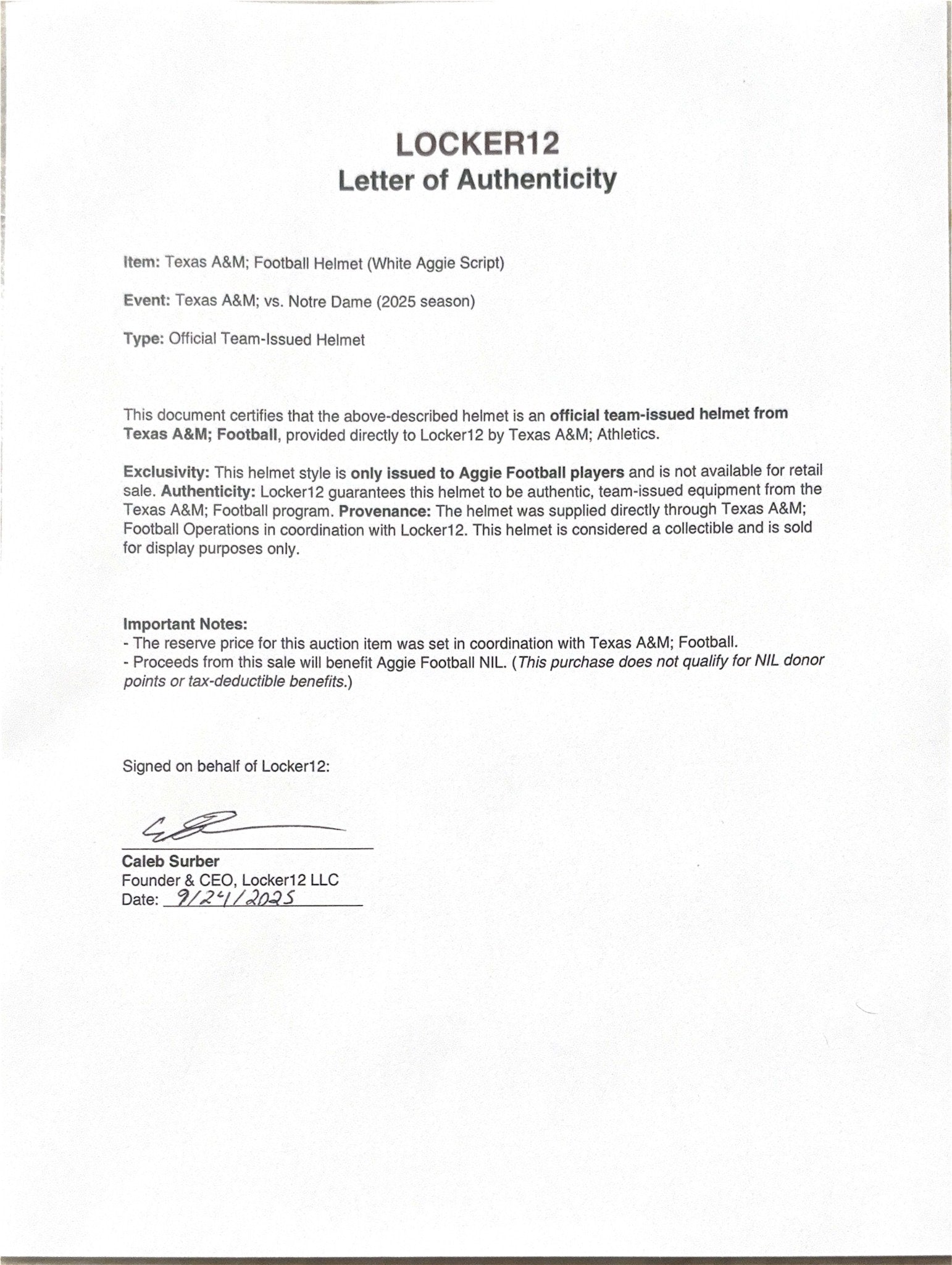 - Direct from Aggie Football: Comes with a Locker12 Letter of Authenticity verifying it as an official team-issued helmet from the Notre Dame game.